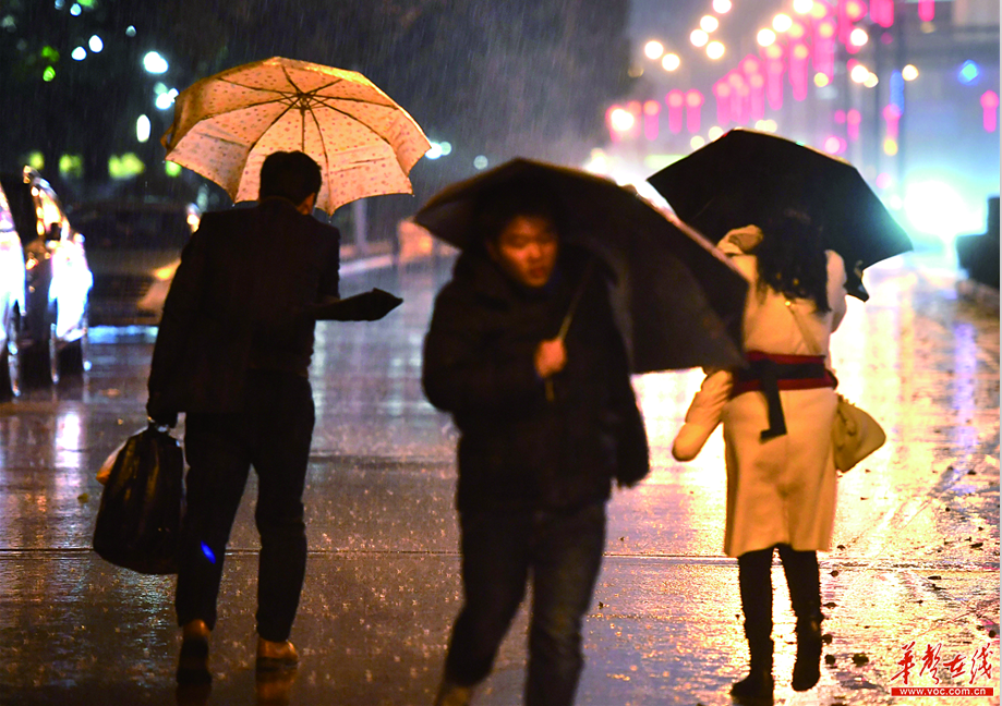 2月21日晚,长沙市湘江大道上,寒风雨夜中,市民打着伞在路上行走。当天,我省大部分地区迎来寒潮天气,气温陡降。气象部门提醒广大市民,请及时添衣、谨防感冒。记者 郭立亮 摄