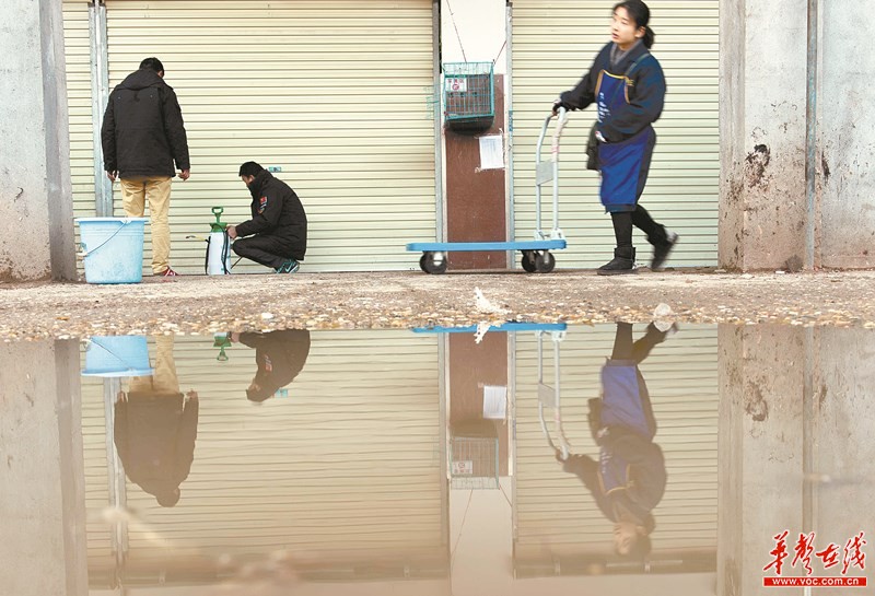 2月9日,长沙市马王堆金祚农贸市场,活禽交易区域已关闭,工作人员在进行消毒处理。目前, 长沙市活禽市场全部休市。 记者 唐俊 摄