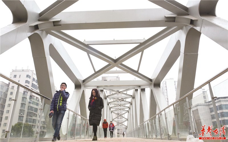 2月7日,市民在长沙万家丽路双城路口人行天桥上行走。该桥日前全面焊接完成并正式开放,雨棚将在本月内安装。该桥主跨64米,桥面宽5.8米,为湖南跨度最大的钢桁架人行过街天桥。 记者 唐俊 摄