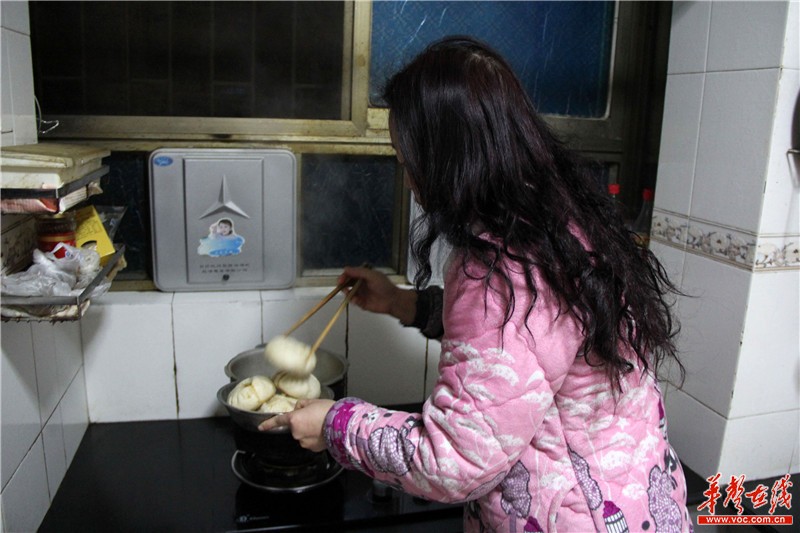 谢华在上班前为丈夫热上早餐,以方便他回家后就能吃上一口热的,能及时休息。