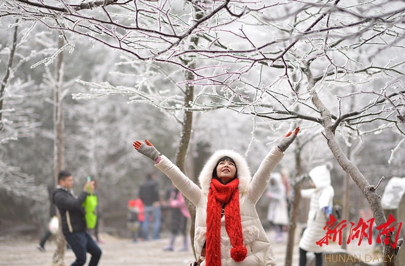 2月2日,游客在张家界天门山观赏雾凇。连日来,受寒潮影响,天门山顶气温降至零下6摄氏度左右。春雪纷扬而下,山顶丛林化身雾凇森林,形态各异的冰花、冰挂比比皆是,恍若琉璃仙境。董兵摄