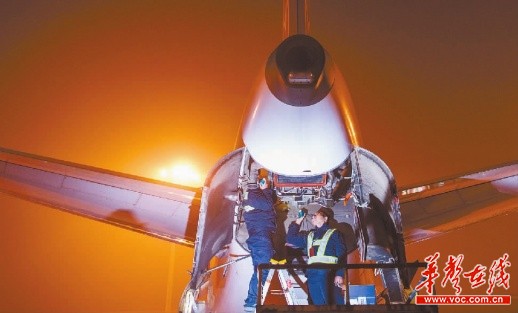 3月7日凌晨1时23分,长沙黄花国际机场,机务人员涂武林(右)和张怡在检修飞机。机务人员的晚班工作时间为22时至第二天早上6时。每天深夜,停机坪上都有他们为飞机“体检”的忙碌身影。涂武林对这份工作最大的感受就是压力大:“我们要确保飞机上每一个细节都没有问题。”