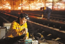 3月1日凌晨3时30分,高铁长沙南站,28岁的长沙电务段信号工张津铭(左)和25岁的潘腾飞在铁轨上检修信号设备。凌晨零时至4时检修,这样的工作张津铭已干了3年。他觉得辛苦都不算什么,只是作息时间和常人不同,很难交到女朋友。他希望在新的一年里能交到心仪的女朋友。