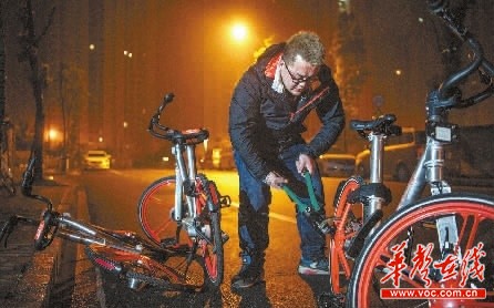 3月17日凌晨零时45分,长沙市文化艺术中心地铁站附近,共享单车运营专员王镇涛忙着剪开几辆单车上的私锁。破坏车辆、上私锁、停在非公共区域,共享单车的这些问题都需要他们去解决。晚上22时到第二天早上6时,他们在城市里到处奔波,每人要处理大约40辆问题单车。