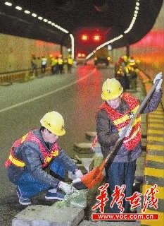 3月20日零时58分,长沙市营盘路隧道,长沙市住建委路桥处45岁的隧道养护工朱发茂(右一)和30多位同事进行隧道清淤工作。他们在凌晨零时至早上6时隧道封闭(半封闭)期间工作,面临最大的难题是时间短,工作量大,还有交通安全问题。