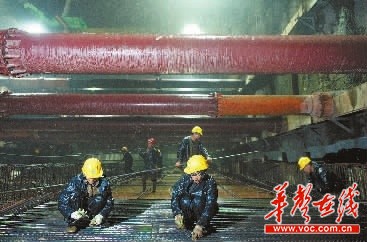 3月9日凌晨零时24分,长株潭城铁尖山站建设工地,钢筋工人许亮亮(前排左二)和工友冒着大雨在扎钢筋。为了不误工期,他们实行两班倒,一班12小时。不管刮风下雨,基本没有停工的时候。