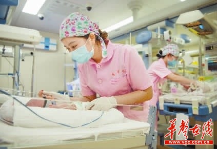 3月10日凌晨2时,湖南省妇幼保健院,护士段丽琼(左一)在新生儿重症监护室照顾小宝宝。夜班护士上班时间为零时至8时。期间,她们每人至少要换20多片尿布,喂20多次奶,整个晚上都像猫头鹰一样,瞪大眼睛,照看着每一个生病的宝宝,不能有一丝松懈。