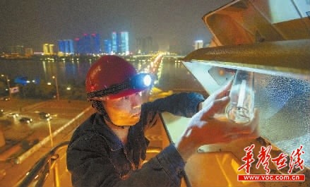 3月11日20时05分,长沙市橘子洲大桥西,路灯检修工张世平在近20米的高空中更换路灯。每当夜幕降临,他们就开始工作,巡视检修辖区内的路灯照明情况,直到深夜12时。一年四季,无论刮风下雨,他们坚持夜间巡查,保障城市里的亮灯率在98%以上。