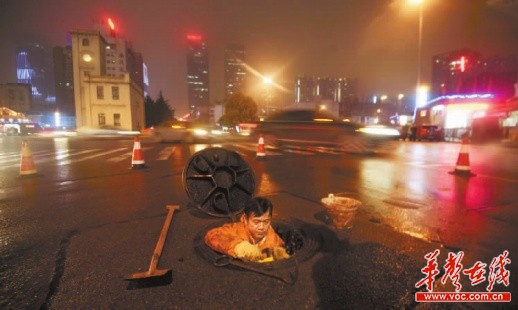 3月23日21时53分,长沙市中山亭,48岁的管道疏浚员袁勤完成下水管道清淤工作后从井里出来。他们工作不分白天黑夜,有“求”必应。刚入行时,让人最难以忍受的,是下水道里大量氨气和沼气带来的臭味,干完一天活后,他连饭都不想吃。文\图 傅聪