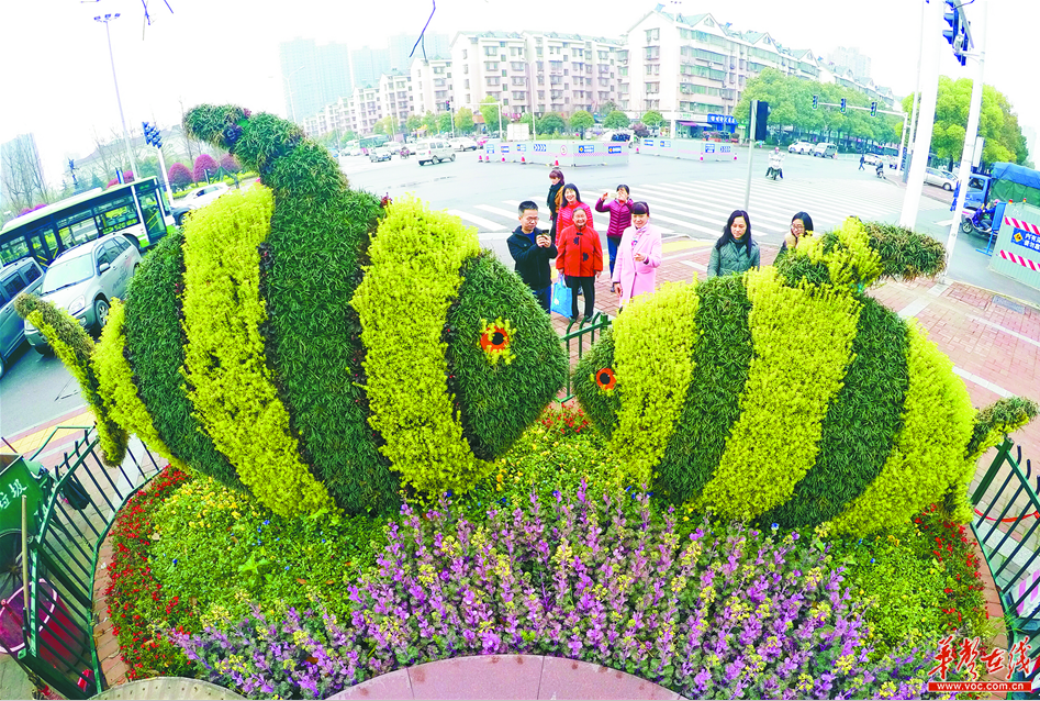 3月21日,长沙市白沙湾路口,市民驻足欣赏“爱”造型主题花坛。当天,长沙市芙蓉区东屯渡街道白沙湾社区打造的150米长婚庆文化烂漫花街对外展示。色彩斑斓的开屏孔雀、萌态十足的亲嘴鱼等由花卉和植物组成的各种“爱”主题花坛,成为长沙一道新的风景。