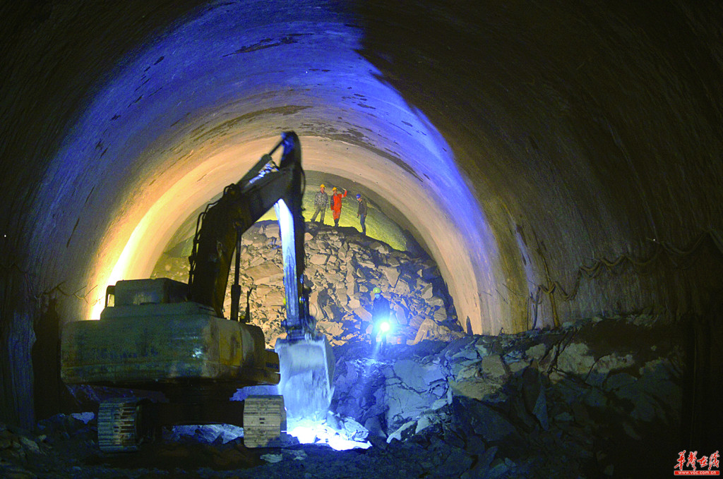 3月16日清晨,长株潭城际铁路西延线尖山段洞通爆破点,施工人员利用工程机械清理渣土。15日,随着尖山隧道内一声爆破声响,长株潭城际铁路西延线尖山段暗挖隧道正式贯通。该隧道是长株潭城际铁路全线唯一单洞双线隧道,隧道全长1324米,洞内高13米,宽11米,从300多米高尖山底下穿过,是整个城铁西延线控制性节点工程,它的顺利贯通为城铁长沙站以西年底开通运营奠定了基础。记者 徐行 摄影报道