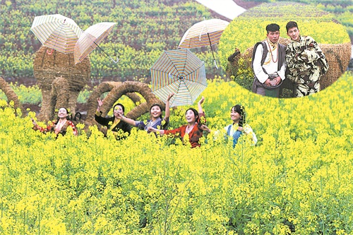 大章鱼、大蟒蛇、大水牛……一件件以稻草为元素编制的动漫栩栩如生,在漫山遍野的油菜花海里,稻草文化生动而富有灵性。迎着绵绵春雨,农科园校企合作单位——永州职业技术学院2016级藏族班班主任翟韬挑选班上12名美少女到此采风来了。拾级而上的油菜梯田吸引美少女拍照,一袭红色藏服的次仁白珍旁,“高原红”的昂乾达杰、桑丁班久两个藏小伙抢了风头。格桑德吉、元登曲珍嗅着芬芳的油菜花用那不流利的普通话说,这黄花就像我们家乡的麦浪,有家的气息。顺着绵延的自行车赛道就是茶花村的磨子岭,尼玛玉珍一展歌喉,少女们和小伙踏着节拍跳起了欢快的藏族舞。一旁欣赏的市政公司张军一家不忘鼓掌叫好。