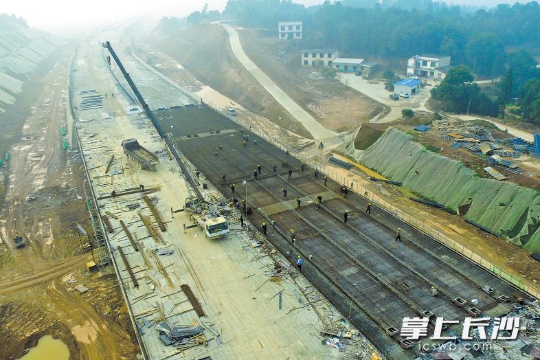 记者昨日获悉,目前星沙联络线长沙县段万家丽路以西至捞刀河大桥以东主体工程已完成,捞刀河以西段和捞刀河大桥主体已基本完工,至此,星沙联络线万家丽路以西实现主线贯通,预计今年6月底通车。图为昨日下午,星沙联络线苑景路桥梁上,工人们正在进行施工。