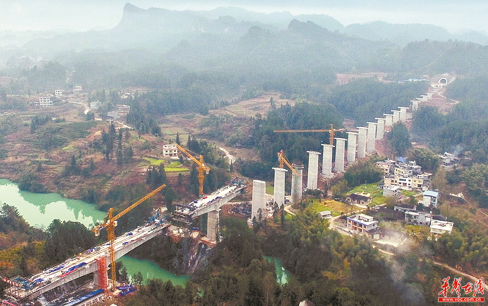 2月27日,航拍施工中的黔张常铁路龙山县狮子村特大桥。黔张常铁路起于重庆黔江区黔江火车站,途经湖北咸丰县、来凤县,湖南龙山县、永顺县、桑植县、永定区、慈利县、桃源县、鼎城区、武陵区,终点为常德火车站。线路全长339公里,总投资384.4亿元,设计时速200至250公里,是渝长厦(重庆—长沙—厦门)快速铁路的重要一段。黔张常铁路项目2014年12月动工,计划2019年建成通车。曾祥辉 宋国胜 摄影报道