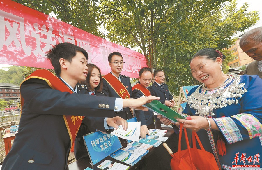 4月20日,通道侗族自治县皇都侗寨,税法宣传志愿者在宣传税法政策。连日来,该县国税局、地税局联合开展以“深化税收改革、助力企业发展”为主题的税法宣传活动,通过“面对面交流”、上门问“诊”等方式为纳税人解读小微企业税收优惠政策,让更多纳税人享受税收惠政。 刘强 摄