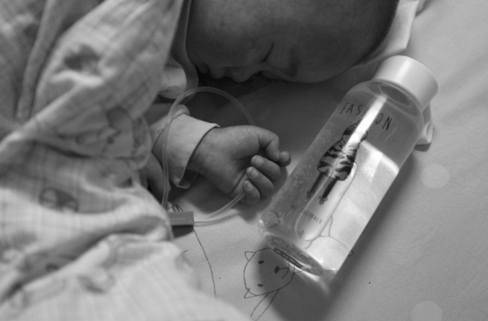 4月18日,湖南省儿童医院,泡澡时意外溺水的小若(化名)躺在病床上接受治疗。图/记者华剑