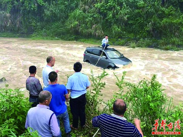 5月22日上午,湘西州永顺县一辆商务车被洪水困住,民警赶往现场实施救援。 永顺公安 供图