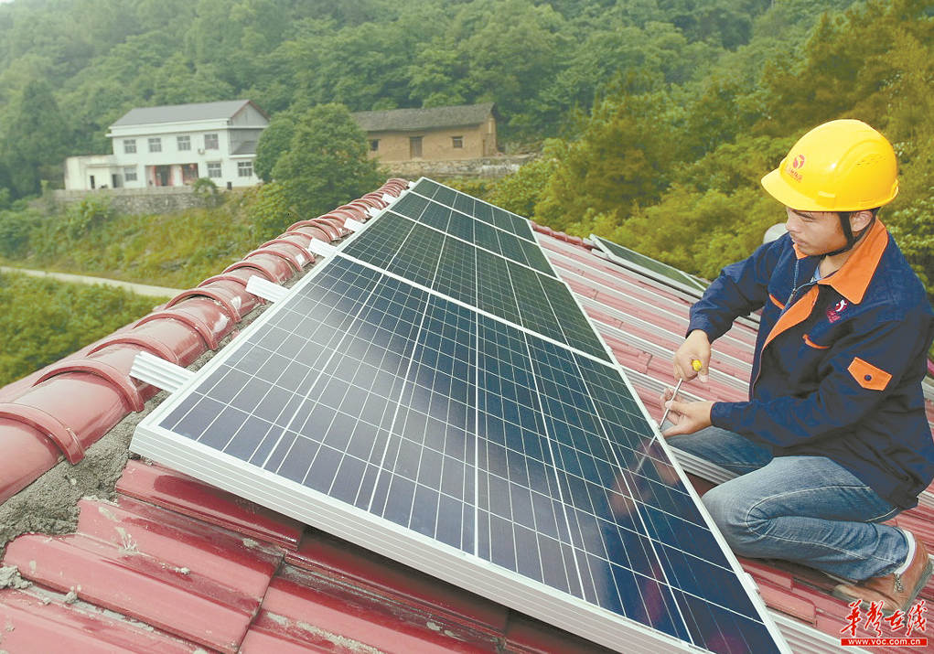 5月21日,慈利县东岳观镇江西村,工人在村民万宏元的屋顶安装10千瓦光伏发电组件。万宏元的妻子患有尿毒症,儿子在读大学,96岁的母亲双目失明,他在外务工收入微薄,是典型的贫困户。今年,对口帮扶单位县公路局帮助他获得了小型光伏电站扶贫项目。22日并网发电后,年发电量可达1.2万多度,实现纯收入1.2万余元。