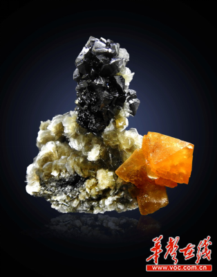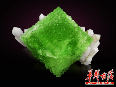 这块八面体的萤石与水晶共生,这块小白色水晶衬托这块硕大的晶体,浑然天成,加上它的颜色艳丽、形状独特、晶莹剔透,像是一份艺术品,令人神往。