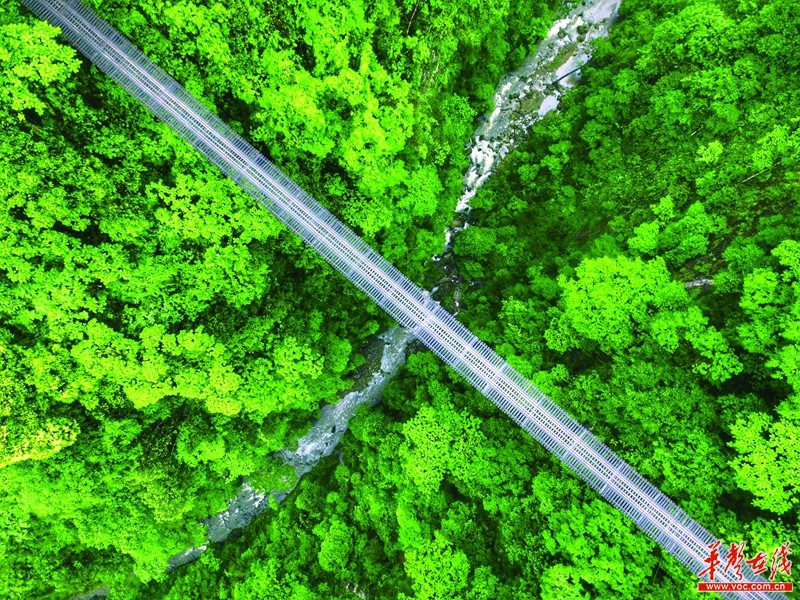 5月7日,石门县壶瓶山镇,海拔1291.8米的剩头山,孤峰壁立,仅有东侧峡谷上一吊桥为进出通道。吊桥为1988年架设,全长116米、宽2.5米,飞架在两山绝壁上,气势恢宏。