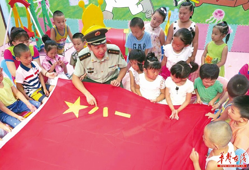 “八一”建军节将至,7月27日,郴州市公安消防支队特勤中队官兵来到辖区幼儿园给小朋友们讲军旗故事,对孩子们进行国防教育。