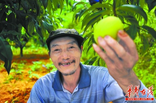 7月27日,桂东县沤江镇禾坪村,贫困户陈登旺对他家即将采摘的20多亩黄桃充满期盼。罗徽 摄