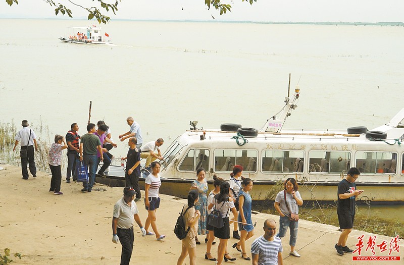 7月9日,岳阳市君山岛公园,游客上岛游玩。前段时间,洞庭湖持续的高水位导致该公园湖水倒灌,部分亲水平台、游道、码头被湖水淹没,入园交通受阻,公园于7月1日闭园。目前汛情缓解,经公园工作人员清淤排涝,景区恢复正常,公园恢复开放。湖南日报记者 徐行 摄
