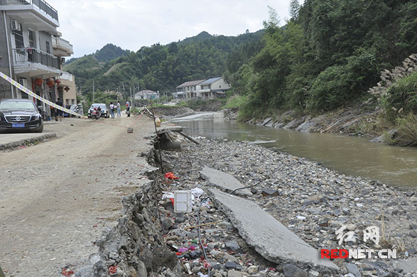 沩山乡祖塔村一条道路遭洪水侵蚀后的样子。