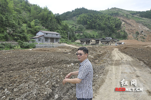 宁乡市沩山乡祖塔村村支书杨明元向记者讲述泥石流发生时的现场情况,他和其他二十多名前来救援的村民被冲出几百米远。