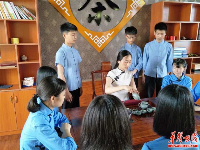 学校茶艺室内,王乐乐她们正在这里跟着学校茶艺师李素如老师学茶艺,烫壶、置茶、注水、倒茶、分茶、奉茶、去渣,学生们听得非常认真,学得非常专注,他们在这里泡茶、品茶,谈论着茶俗……整个茶艺室内弥漫着浓浓的茶香。 记者走进该校,浓浓的茶文化气息扑面而来:教学楼、教室宿舍、科教楼、学生公寓、综合楼变成了博雅楼、儒雅楼、清雅楼、静雅楼和隽雅楼,十大名茶传说、十首著名茶诗、十种茶俗镶嵌博雅楼中,并在二楼设有茶艺馆;茶文化元素已恰到好处地融入到了校园文化当中。