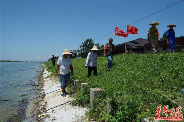 7月4日下午,岳阳市君山区洞庭湖大堤柳林洲段,防汛人员正进行巡查。记者 徐行 摄