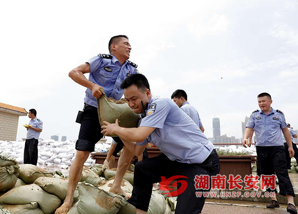 在湘江开福寺责任点上,开福公安分局刑侦大队民警正奋力将沙袋扛上围堰。