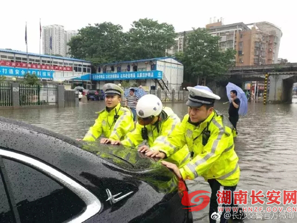 6月30日上午,大雨如注,芙蓉交警大队民警在执勤中发现道路积水中一台抛锚车车主手足无措,民警立即冒雨蹚水将车奋力推至路边等候救援。路过的群众无不竖起大拇指赞扬“交警同志好样的!”