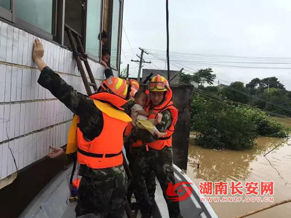 7月1日,长沙市公安消防支队迅速在全市范围内集结调派消防官兵170名,冲锋舟(橡皮艇)16艘,水域救援器材800余件(套),消防照明车2台,救援消防车8台,通信保障车1台,组成2支抗洪救援突击队,分赴全市受灾最严重的望城、浏阳、宁乡等地开展抗洪抢险救援工作。7月1日,望城区乌山镇蓟家巷村发生洪灾,不少群众被困,望城公安消防大队随即出动3台消防车、24名官兵赶往现场救援,在乌山街道和区武装部的共同配合下,成功营救遇险群众98人。