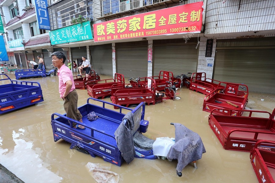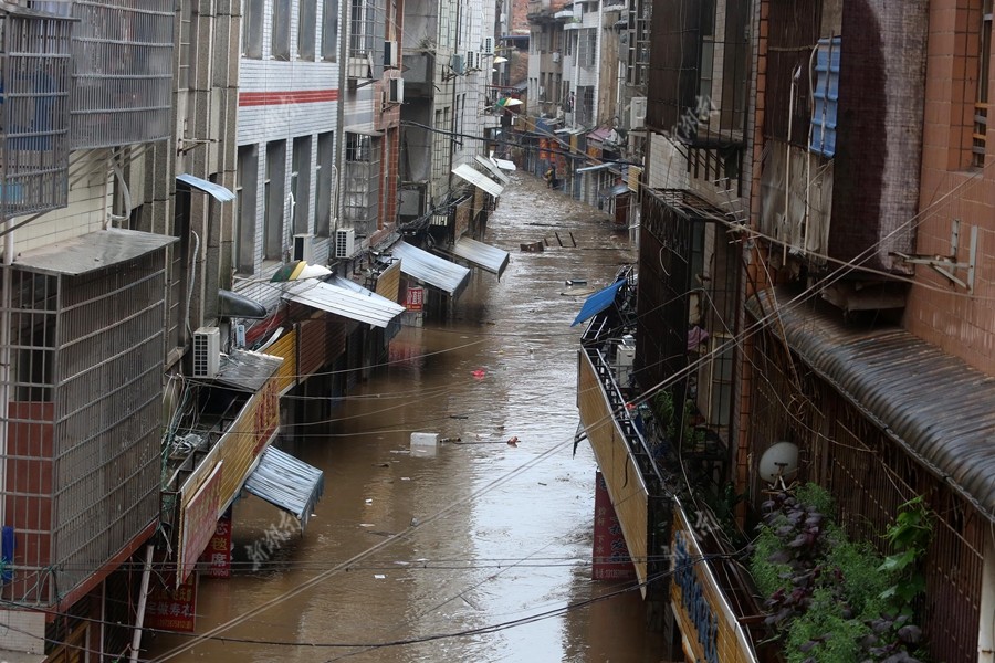 7月1日,湖南省娄底市遭遇暴雨袭击,老街许多房屋被淹。
