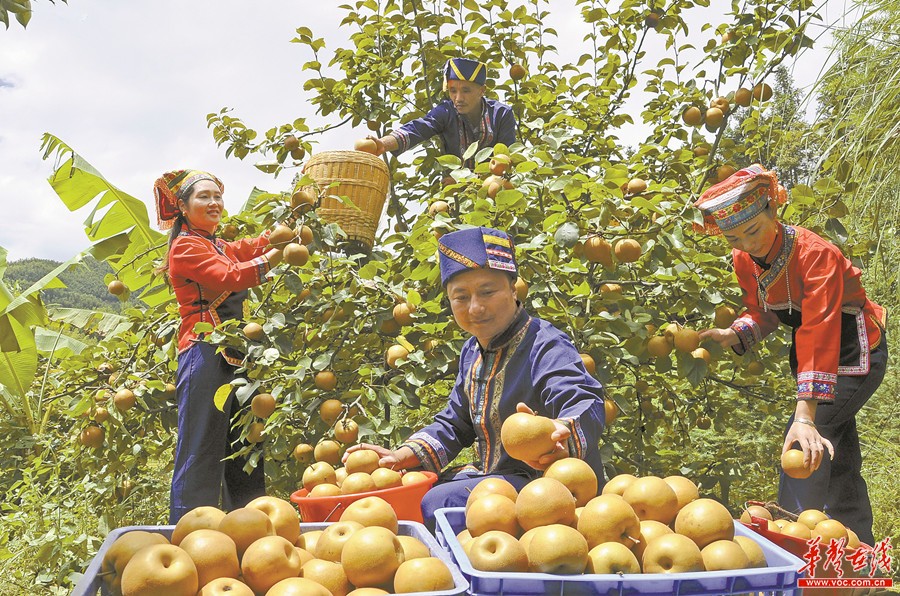 8月29日,新宁县麻林瑶族乡麻林村,瑶族群众在采摘高山金秋梨准备外销。该村于2014年开始种植高山金秋梨。目前,该村种植高山金秋梨面积达100余亩,亩产约2500公斤,已成为该村扶贫产业。 郑国华 郑远江 摄影报道