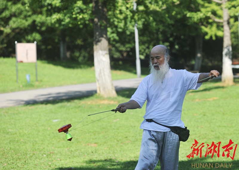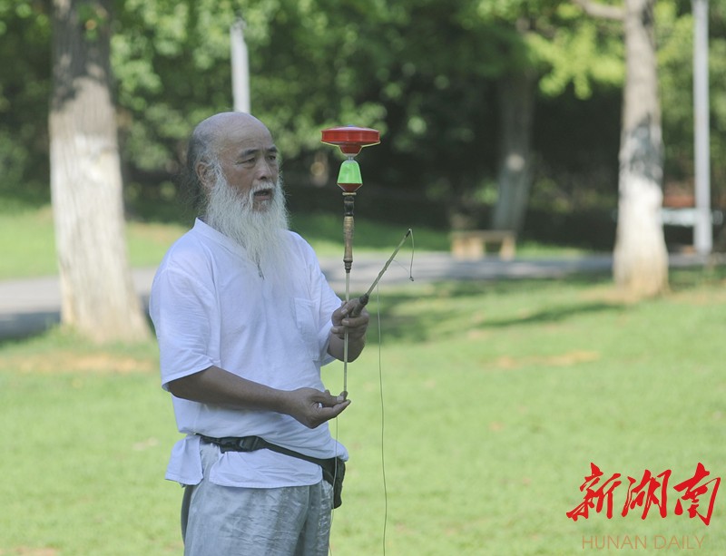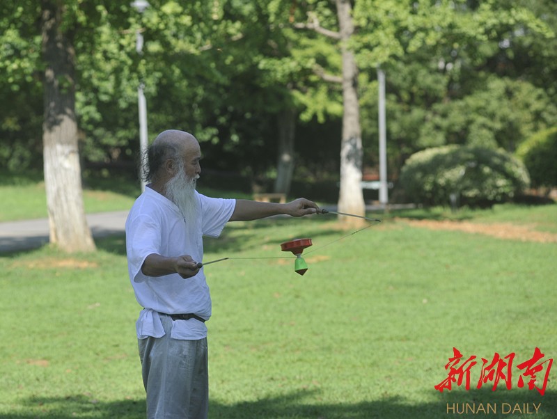 这名有着和姜太公一样胡须的老人叫甘正和,马栏山人。每日下午3点以后,准时在月湖公园进行体育锻炼,其“花式”常引得路人驻足观看。这个飞旋的陀螺叫“空竹”。用两根棍子牵着一根线,拉动一个塑料做的陀螺不停地旋转。看起来很简单,其实它可以衍化出1000多套动作玩法。(新湖南客户端记者 曾鹤群 摄影报道)
