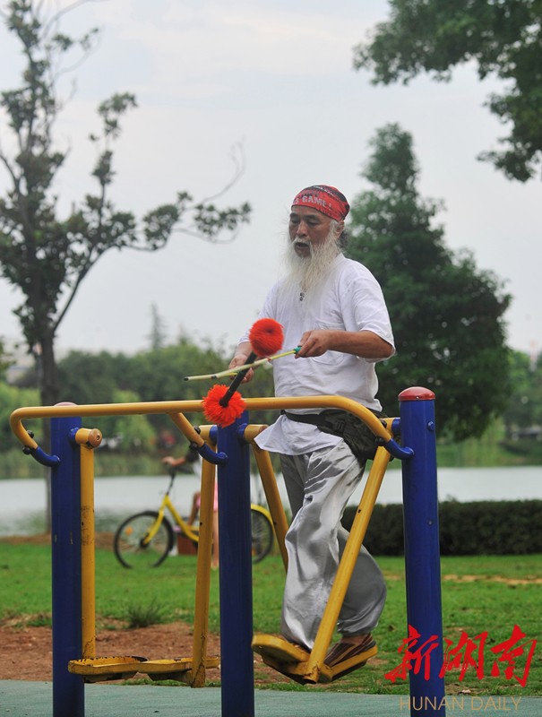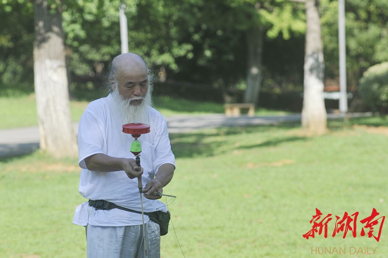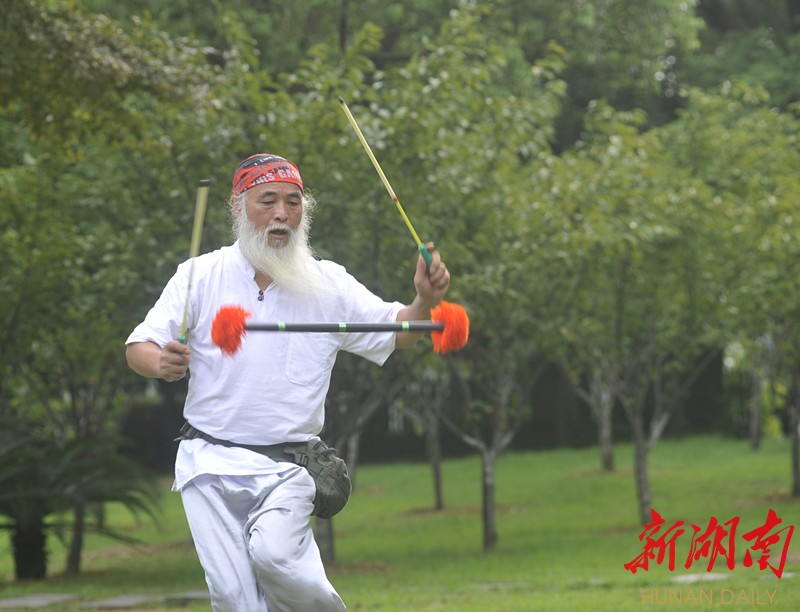 “这个是我首先从北京08年奥运会以后引进到湖南的体育项目。”据老人介绍,“花棍”在解放前是北方乞丐讨米用的表演手段。解放后,随着人民生活水平的提高和国家对非物质文化遗产的重视,这三根棍子慢慢变成了北方人民健身娱乐的方式。(新湖南客户端记者 曾鹤群 摄影报道)