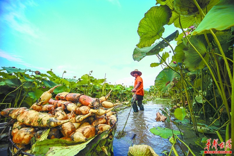 8月16日,龙山县石羔街道泗坪村,农民在采挖莲藕。近年来,该村利用区域优势,发展莲藕、百合等经济作物种植。目前,数百亩莲藕喜获丰收。