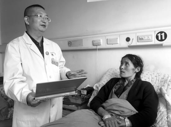 藏医院大外科主任戴卫东是中南大学湘雅二医院肝胆外科副教授,援藏刚半个月,他做了一台胆囊癌根治手术。患者是个50多岁的牧民,本来想去成都治病,但经济困难。听说藏医院来了援藏医生,他赶了过来。