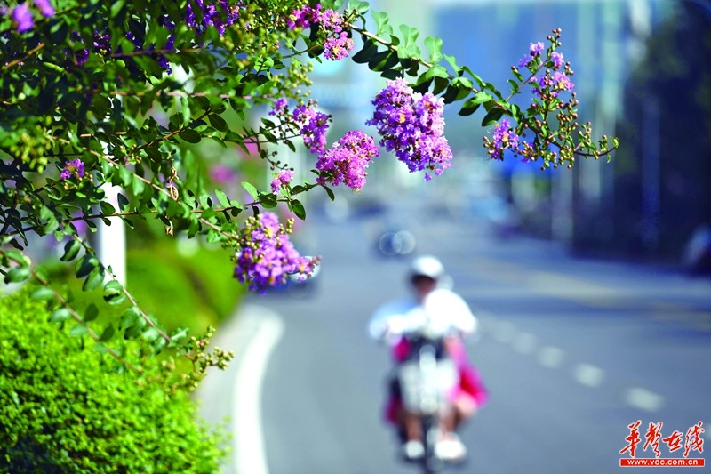 8月6日上午,长沙麓枫路麓谷公园段,一些行人车辆从路边盛开的紫薇花边经过。当前,正是紫薇花开的季节,在长沙的一些公园景点及道路边,紫薇花开正艳,大朵大朵的紫红色花朵绚如烟霞、烂漫如火,给这个炎热的夏日增色不少。记者 田超 摄