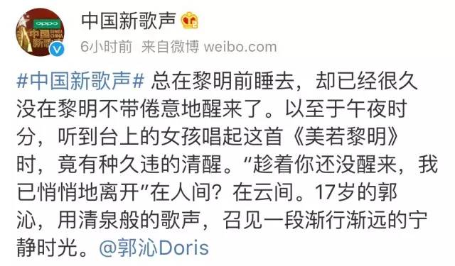 郭沁说:这次参加中国新歌声对我来说是一次很难得的锻炼机会,在这期间得到了节目组,学校,父母,朋友的大力支持和鼓励,所以登上这么大的舞台,除了兴奋和开心,还有感动和感恩。希望自己能不辜负大家对我的期望,不忘初心,继续用心好好唱下去。(文/长沙市明德中学微信公众号)