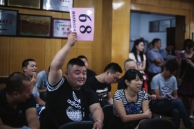 8月4日,湖南省拍卖公司,竞拍者正在上缴礼品拍卖会上举牌。组图/记者陈韵骄