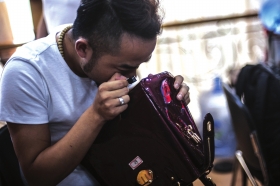 竞拍者正在检查一件拍下来的“紫红LV包”。