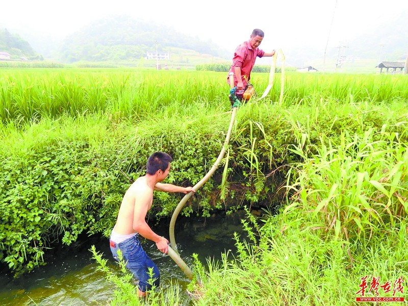 7月30日上午,新晃侗族自治县贡溪镇上田村,村民在抽水灌溉农田。近期持续高温天气,该镇部分高位农田出现脱水开坼现象,村民积极抗旱输水,缓解旱情,确保稻谷丰收。