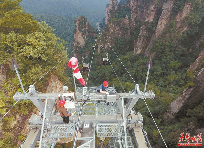 9月28日,张家界武陵源景区,工作人员对天子山索道进行安全巡查。黄金周将至,该景区组织人员对景区索道、电梯、观光电车、游船等设施设备进行全面检查,排除安全隐患。