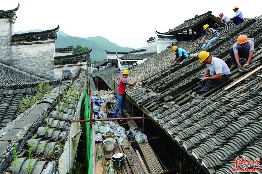 洪江市黔城古建筑群施工人员在修缮屋顶