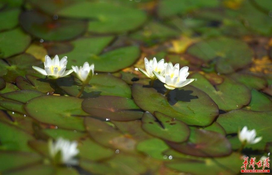 9月19日,桂东县沤江镇寒口村一山塘里,一池莼菜郁郁葱葱,开满朵朵白花。当天,桂东县林业局科技人员在海拔1200余米的山塘里,发现了国家Ⅰ级重点保护野生植物莼菜。莼菜,属睡莲科,是多年生水生草本,根状茎细瘦,横卧于水底泥中,叶漂浮于水面,椭圆形状,能食用,且具有极高医用价值。湖南日报记者 郭立亮 通讯员 邓仁湘 摄影报道
