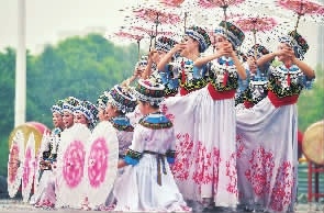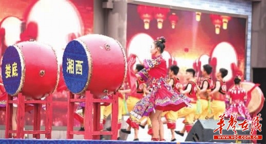 “我美丽的家乡,牛角山寨哟,高岭隔沅酉,吕洞遥相望,美在默戎河,巴岱有洞藏,三月杜鹃连天红,四月黛勾黛丫香……”短短7分钟,“我美丽的家乡”、“扯扯扯”、“拦门酒”三支歌舞轮番登台,湘西的少男少女们用不打一丝折扣的表演,从生活、恋爱、迎客三个方面淋漓尽致地展现了湘西风情,也将现场气氛推向高潮。