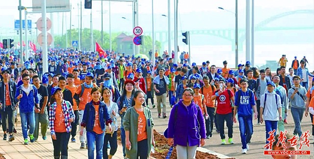 百公里毅行长沙市岳麓区坪塘镇段,徒步者走在湘江西岸。